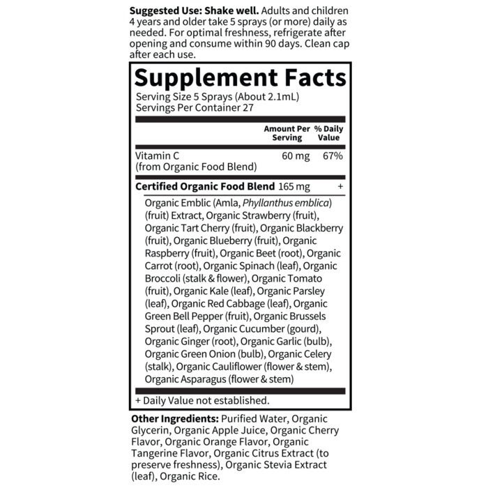 Ingredients: Vitamin C (from Food Blend), Certified Food Blend (Emblic (Amla, Phyllanthus emblica)(fruit) Extract, Strawberry (fruit), Tart Cherry (fruit), Blackberry (fruit), Blueberry (fruit), Raspberry (fruit), Beet (root), Carrot (root),, Spinach (leaf), Broccoli (stalk & flower), Tomato (fruit), Kale (leaf), Parsley (leaf), Red Cabbage (leaf), Green Bell Pepper (fruit), Brussels Sprout (leaf), Cucumber (gourd),, Ginger (root), Garlic (bulb), Green Onion (bulb), Celery (stalk), Cauliflower (flower & stem), Asparagus (flower & stem))